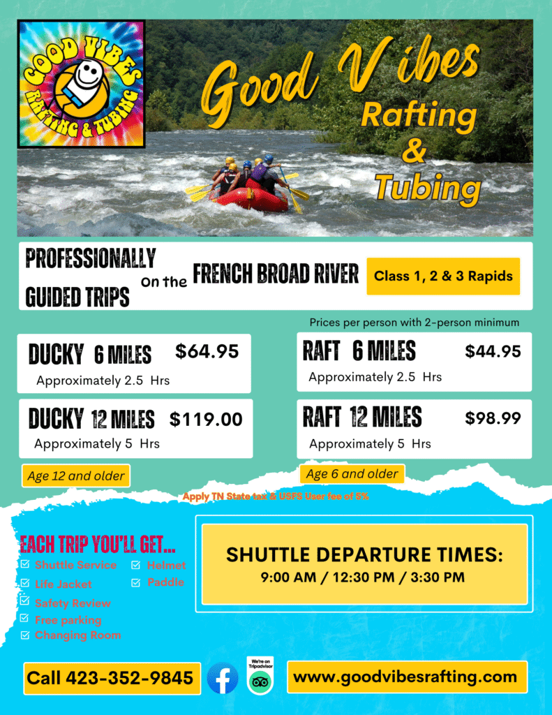 At Good Vibes Rafting & Tubing, we blend exhilarating river adventures with the serenity of nature. Situated along Tennessee’s scenic French Broad River, our guided rafting, kayaking, and tubing experiences offer both thrill and relaxation.